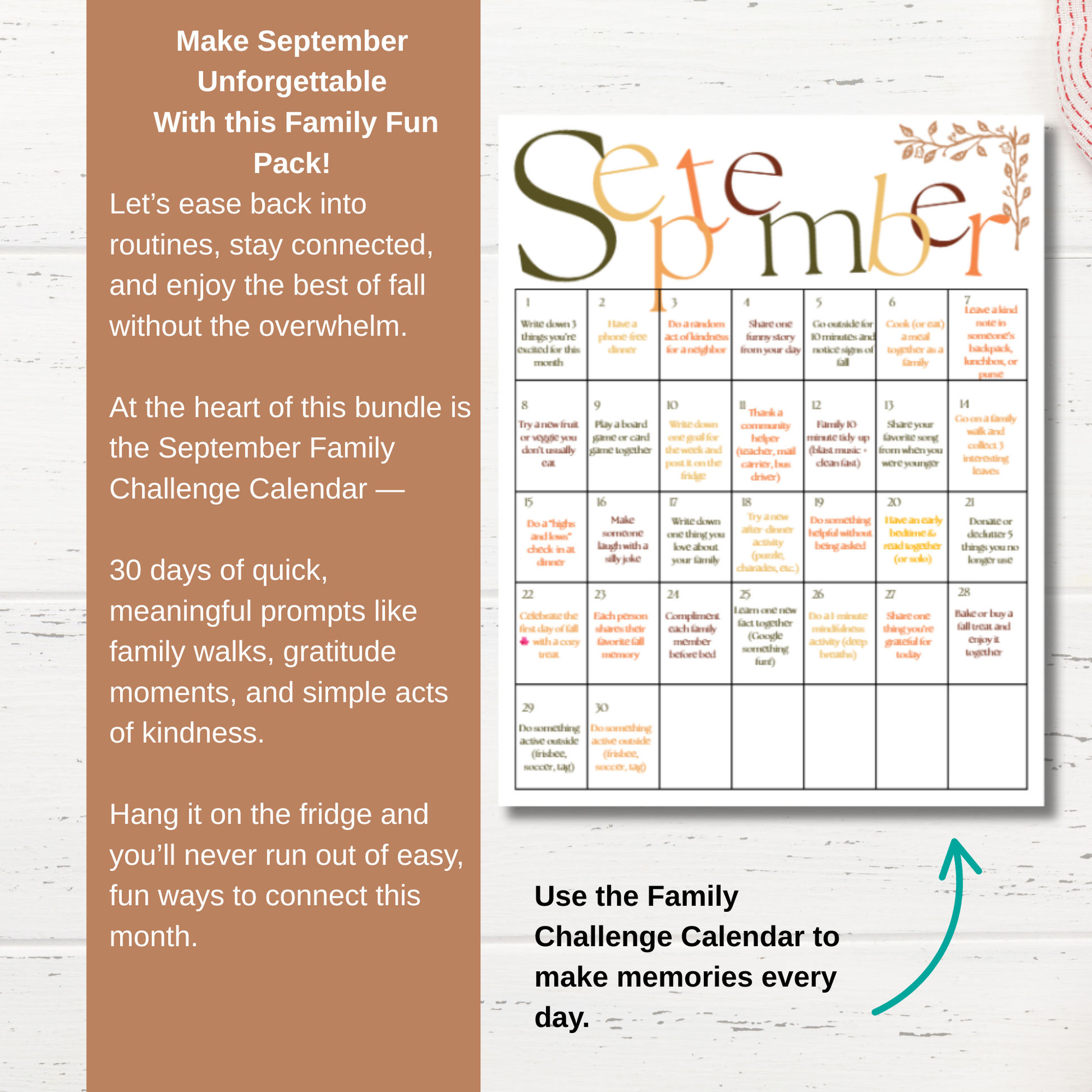 At the heart of this bundle is the September Family Challenge Calendar — 30 days of quick, meaningful prompts like family walks, gratitude moments, and simple acts of kindness. Hang it on the fridge and you’ll never run out of easy, fun ways to connect this month.